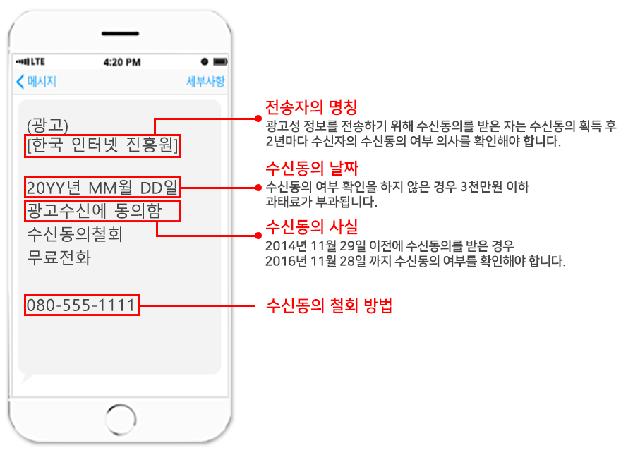 · 반드시 광고성 정보가 시작되는 부분에 '(광고)' 문구를 표기 합니다. · 수신자가 광고 발신지 및 광고발신자를 인지 할 수 있도록 전송자의 명칭과 연락처를 표기 합니다. · 수신거부ㆍ수신동의철회를 할 수 있는 방식을 수신자가 비용을 부담하지 아니한다는 것과 함께 안내 합니다. · 수신거부ㆍ수신동의철회를 할 수 있는 방식을 광고성 정보가 끝나는 부분에 '무료거부' 문구를 사용하여 표기합니다.